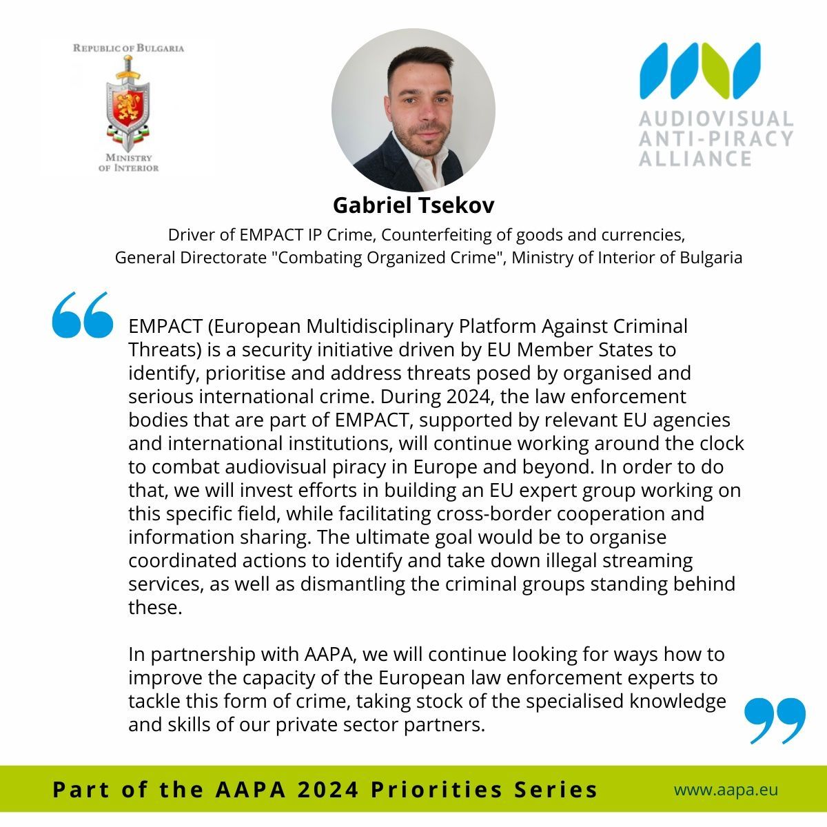 The Audiovisual Anti-Piracy Alliance (AAPA) publishes its first Manifesto, linked here . The document aims to recognise past efforts of EU legislators when it comes to content protection and the fight against copyright infringement, whilst admitting that more can and should be done to address this growing issue. Miruna Herovanu, Executive Director of AAPA said : " After years of laying the groundwork to combat online piracy it’s time for EU policymakers and beyond to fully acknowledge that decisive, targeted measures are needed at the European level. The rise of digital theft demands action. We call for strong political resolve to end the theft of our members' content. We're ready to support every stakeholder—law enforcement, policymakers, and industry representatives—to dismantle criminal networks and protect European consumers from harm."