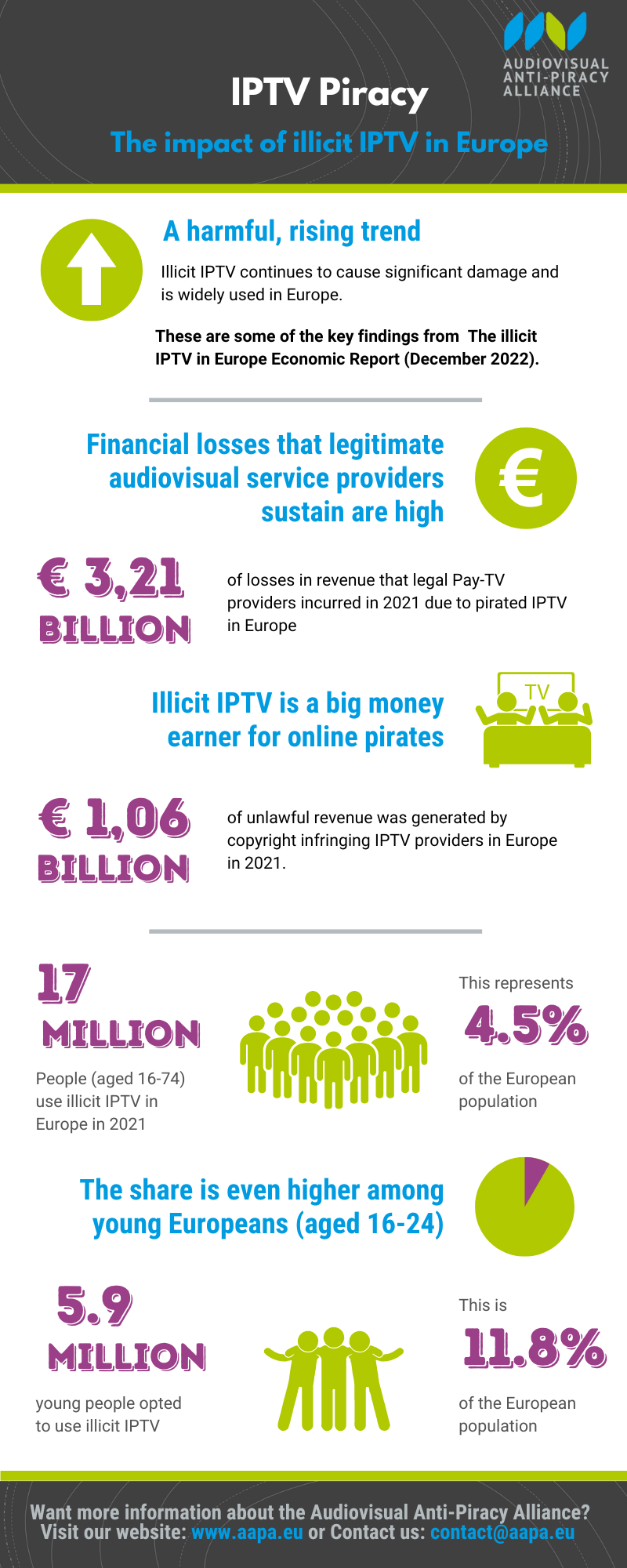 Alicante, Spain – 30 April 2025 – The Audiovisual Anti-Piracy Alliance (AAPA) is urging policymakers to take decisive action against online piracy of live events following a key industry meeting hosted by the European Union Intellectual Property Office (EUIPO). This gathering brought together leaders from the European Commission, Member States, rights organizations, media companies, and tech platforms to assess the impact of the Commission’s Recommendation on combating online piracy , issued on 4 May 2023. Despite ongoing industry efforts, findings from the most recent second Grant Thornton study (March 2025) reveal: Little to no reduction in piracy levels since May 2023 No meaningful action from online intermediaries to curb piracy The Digital Services Act remains underdeveloped in addressing live content piracy Critically, Internet Service Providers (ISPs) and technical intermediaries have not participated in data collection, their silence serving as an indicator of the Recommendation’s limited impact. The Urgent Call for Legislation AAPA and industry stakeholders insist that voluntary measures are failing. To protect content creators and broadcasters an concrete update of legislation is mandatory, potentially through an extension of the DSA, including: A precise definition of “expeditious” action for live event protection A clear and enforceable Know Your Business Customer (KYBC) provision Broad inclusion of all relevant intermediaries Oliver Pribramsky, co-President of AAPA , Head of IP & Content Protection and Committees, DFL Deutsche Fußball Liga GmbH stated: "We welcome the discussion, but talk is not enough. Without concrete regulation, rightholders will continue to hemorrhage resources, limiting their ability to reinvest in valuable content. The time to act is now. Thank you to our esteemed colleagues from 2 CANAL + and Premier League, both members of our association, for representing the live rightholders’ point of view during the debate" AAPA looks forward to contributing to the recently opened Call for Evidence on Piracy of Live Content to plea once again that the fight against piracy demands urgent legislative support—industry efforts alone are not enough. For more information, contact Miruna Herovanu , Executive Director AAPA