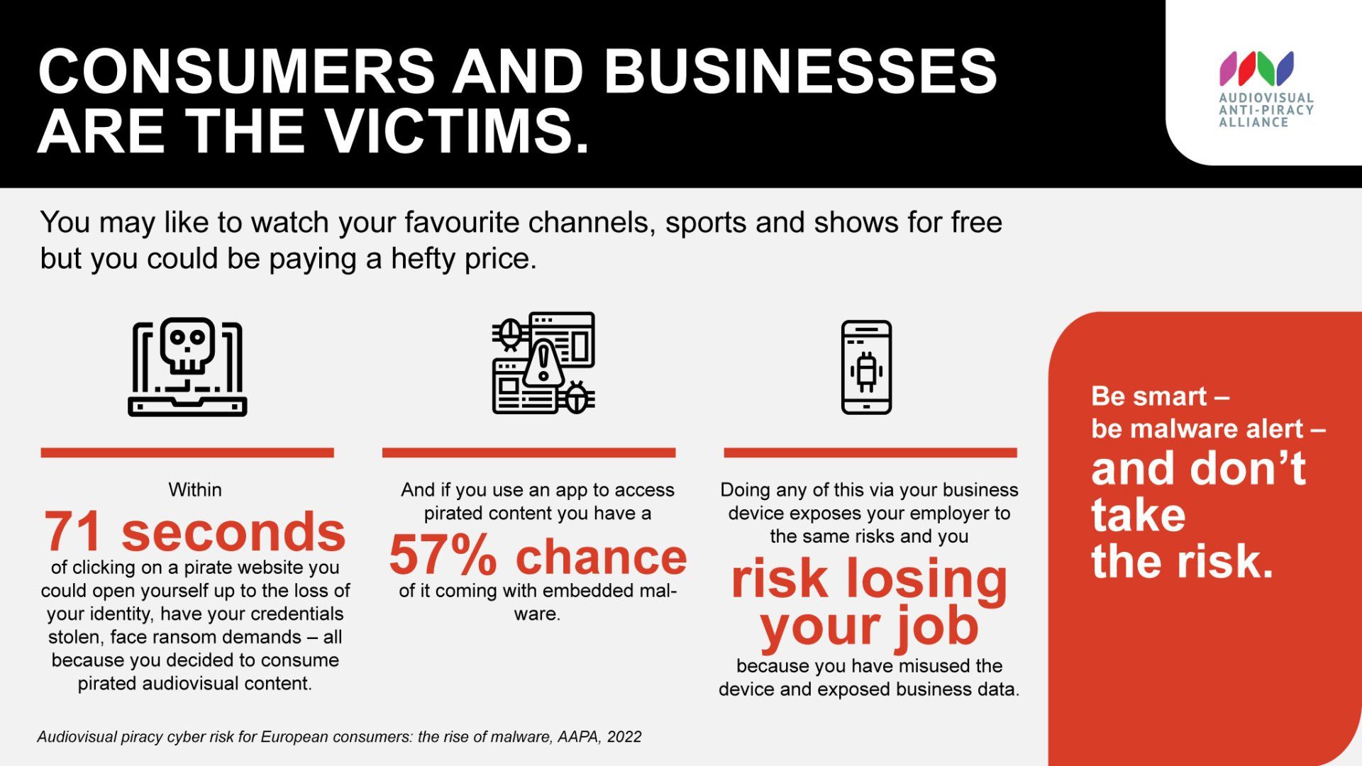 Like consumers worldwide, European users of audiovisual piracy sites, apps, Illegal Streaming Devices, and Set-Top Boxes (STBs), often perceive that they can get “something for nothing” by using these services. Piracy is often perceived to be a victimless crime. The evidence presented in this study shows that the victim is the consumer, through the targeted delivery and installation of malicious software (malware) onto consumer devices, while they use audiovisual piracy sites, apps, ISDs and STBs. The impact of these malware infections can result in identity theft and fraud for the consumer, but also, lateral movement and further infection on any corporate network that they are connected to, such as remote working at home through a Virtual Private Network (VPN). Consumer behaviour is a direct threat to corporate networks, and the commercial consequences could be devastating, especially as more workers choose a flexible work pattern.
