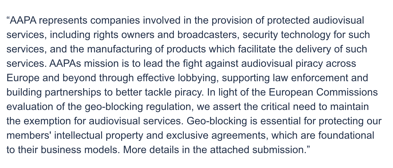 Online piracy has evolved into a structural threat to Europe’s cultural sovereignty, competitiveness and consumer safety. The Commission’s report recognises that existing voluntary and non-binding approaches to online piracy have not delivered the intended results. Piracy continues to grow in scale and sophistication, exploiting new technologies and digital distribution models. It undermines the foundations of Europe’s audiovisual ecosystem and weakens the Union’s ability to invest, innovate and compete globally. Online piracy contributes nothing to Europe’s cultural or economic fabric. Instead, it: • Diverts value away from legitimate creators, broadcasters, distributors while also depriving Member States of significant tax income. • Exposes consumers – including millions of EU citizens – to significant risks. • Connects to fraud, cyber-enabled crime and other illegal activities are well documented. Protecting Europe’s citizens and safeguarding the integrity of the Single Market requires decisive and coordinated EU-level action across its institutions. AAPA strongly welcomes the Commission’s renewed focus on the role of online intermediaries To be effective, the Digital Services Coordinators – supported by the Commission – must drive meaningful engagement and structural change across the intermediaries whose infrastructures are routinely leveraged by illegal operators. This involves not only hosting providers but also: • Digital infrastructure (CDNs, data centres, IP and domain registries, hardware providers) • Platforms and services (social media platforms, streaming services, e-commerce platforms) • Monetisation and reach enablers (payment services, online advertising networks) Clear expectations, transparency obligations and proactive measures are essential. Experience shows that where intermediaries engage constructively, significant progress follows. With many of these actors established within the EU, Commission’s leadership – supported by Parliament and the Council – is indispensable. AAPA also welcomes the Commission’s recognition of the growing use of dynamic blocking injunctions across Member States National authorities have taken important steps to safeguard cultural and creative sectors – through judicially supervised cooperation with residential ISPs, which has delivered: • Effective protection for live content • Reductions in the visibility and accessibility of illegal streams Fragmentation however limits impact. Only a coherent, EU-wide approach anchored in full chain engagement can deliver consistency, predictability and genuine deterrent effect. This is a natural area for EU leadership, completing work already underway in Member States. The Commission should therefore play a leading role in promoting a European framework for piracy blocking and coordinated action across the value chain. AAPA is ready to work with the Commission, Parliament and Council AAPA can support the institutions in shaping meaningful legislative solutions that reinforces Europe’s audiovisual sector and secure a resilient, competitive and culturally rich digital future for all Europeans.